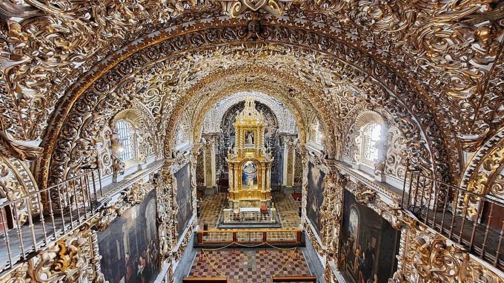 La primera impresión es indescriptible: columnas, nichos, muros y bóvedas cubiertos de detalles minuciosos brillan gracias al oro estofado, un elemento que da vida al estilo barroco que caracteriza a la capilla. Cada rincón parece narrar un fragmento de la devoción mariana de la época, convirtiendo el lugar en un extraordinario ejemplo del esplendor religioso del siglo XVII.