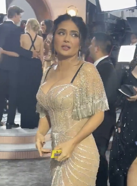 La actriz mexicana Salma Hayek asistió a la entrega de los Golden Globes con un pulparindo y dos mazapanes en la mano, golosinas de la empresa “La Rosa” que se dedica a hacer dulces desde 1950.